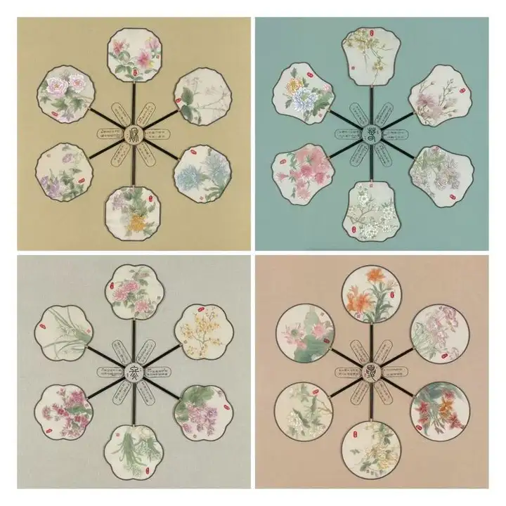艺术家何文以"花语"为媒介,将24节气的时序之美转化为可视的艺术语言,在绢扇上用工笔花鸟“诗书画印”的形式,既延续了中国传统艺术的意境神韵,又融入当代审美表达,通过笔墨、色彩与构图,让春分的桃李争妍、冬至的寒梅傲雪跃然纸上,使节气不再是抽象的时间刻度,而是可感可知的生命图景与文化符号。