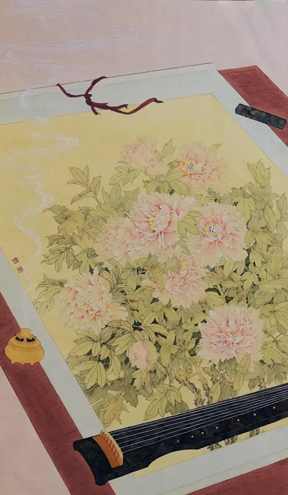 她的工笔牡丹,是最具代表性的符号。《一花一世界,一弦一清心》中,浅粉色的牡丹在泛黄的绢本上舒展花瓣,金线勾勒的花蕊里藏着细碎的光泽,旁侧的古琴与熏炉青烟缠绕,将“花之雍容”与“心之清寂”揉作一处——这不是简单的花卉写生,而是以牡丹为媒介,书写中式生活的雅意。另一幅月夜牡丹图里,淡蓝色的背景晕染出朦胧的月色,鹅黄牡丹似被月光镀了层柔光,花瓣的晕染从浅白过渡到暖黄,层次里藏着她对“花之魂魄”的理解:“工笔不是描‘形’,是画‘神’——要让花像人一样,有情绪,有呼吸。”