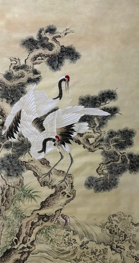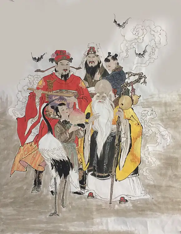 工笔人物则是她细腻的另一种延伸。《福禄寿》图中,寿星的长髯根根分明,孩童的发髻缀着细碎的绒球,连衣袍褶皱里的暗纹都晕染得层次分明,而人物脸上的笑意,却并非程式化的“喜庆”,而是带着生活里的松弛——这份“写实中的写意”,让传统吉祥题材跳出了符号化的窠臼,多了人间烟火的温度。