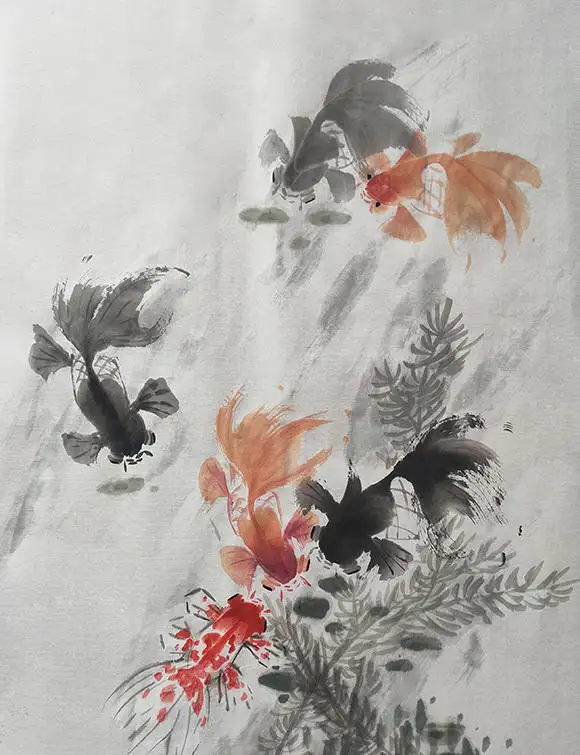 她的写意金鱼,更见灵动。水墨与色彩交织的鱼身,尾鳍以侧锋扫出飘逸的弧度,留白处似是水波流转,三五尾金鱼聚在一处,没有工笔的精细勾勒,却有“往来翕忽”的自在——这份“以简驭繁”的能力,恰是她在工笔沉淀后,对笔墨语言的自如掌控。