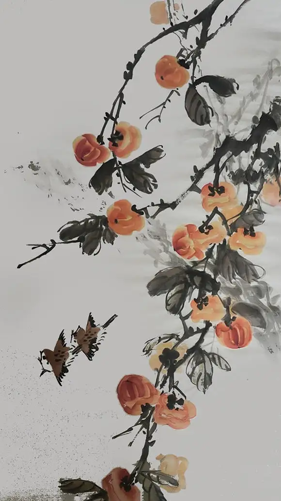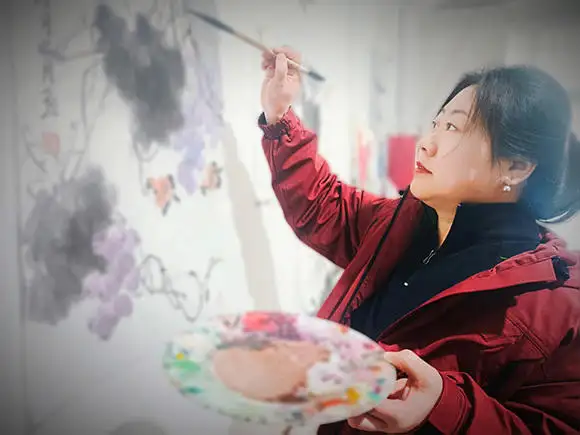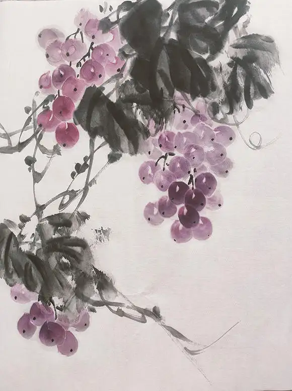 那幅水墨葡萄图,是最好的注脚:墨色的叶瓣以泼墨法晕开,浓淡间藏着风的动感,紫粉色的葡萄以没骨法点染,颗颗饱满得似要坠下纸面,藤蔓的曲线带着随性的缠绕,打破了工笔的规整,却更显生命的蓬勃。“写意要‘写’出情绪”,徐昭月说,画葡萄时,她想起的是家乡院墙上垂落的果藤,笔锋里的洒脱,是对乡野记忆的共情。