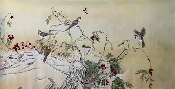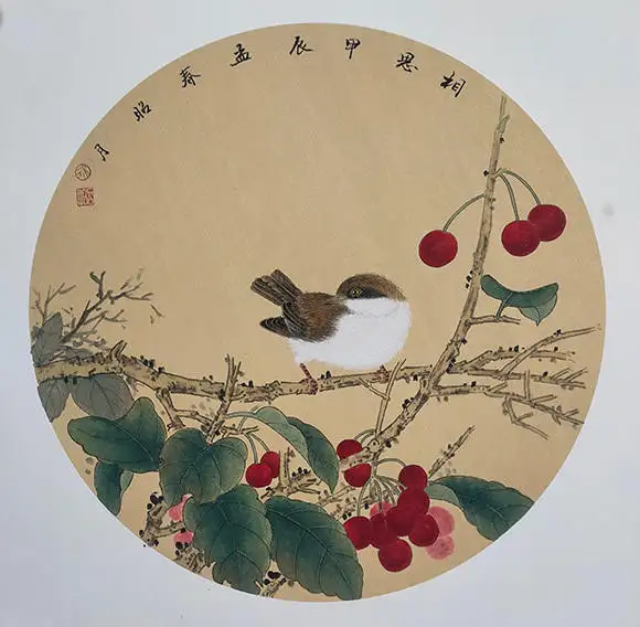 她的工笔花鸟,更藏着对生命的温柔凝视。那幅《相思》圆扇里,栖在樱桃枝上的雀鸟,羽毛的纹理细若发丝,黑亮的眼珠里似有光在流转,红透的樱桃带着欲滴的水润感,连枝桠上的细刺都清晰可见。这种“毫厘必现”的细腻,并非炫技,而是以笔墨为镜,照见自然生灵的鲜活:雀鸟的警觉、樱桃的饱满,在绢本上成了可触的生命质感。