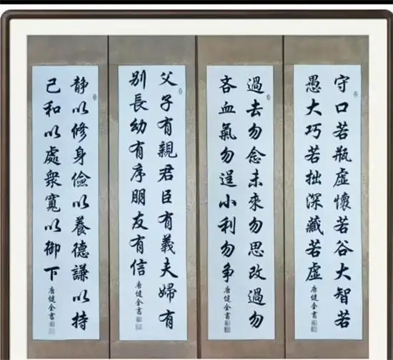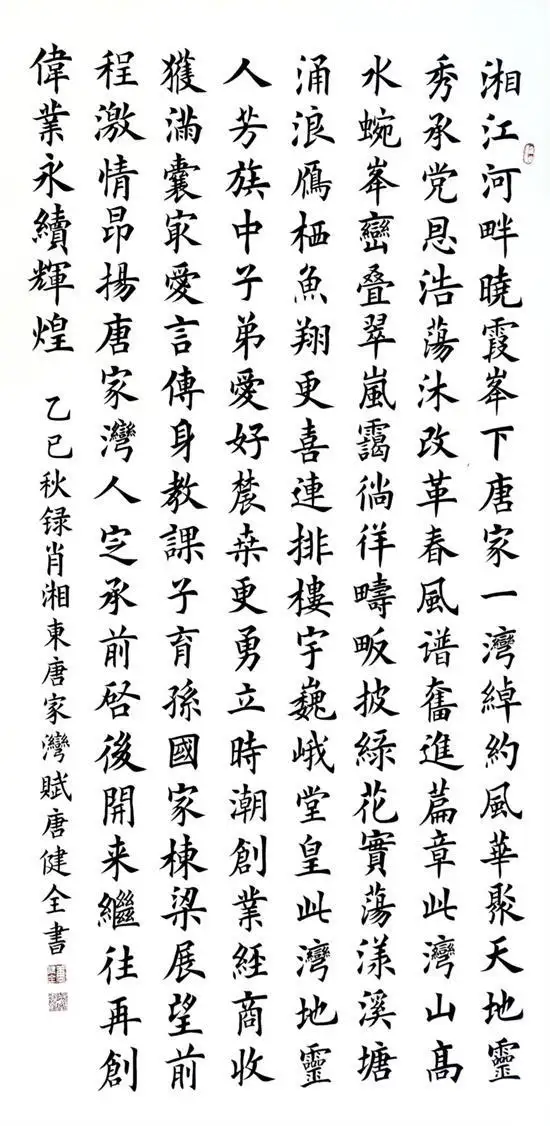 唐健全,笔名湘皖墨缘,湖南衡阳人,中共党员。总书记亲自评定的中国爱国艺术家终身荣誉称号。中央国家机关书法家协会会员,中国国家书画院理事,中国书法家协会理事,享受国务院特殊津贴的艺术家,中国文联书画艺术交流中心顾问,中国楹联学会会员,国家高级书法师,2022年被全国书法领域评为当代杰出书法艺术家。2023年中国两会推荐的杰出书法家等。2023年作品受邀参加了北京地铁,八通线,首都机场等地的书法巡展,并多次参加中央电视台和国内的书法展览活动,同时有多幅作品被拍卖机构拍卖成交。而且有多幅作品被故宫博物院,中国美术馆,人民大会堂永久性收藏。并获中国书画终身成就奖。