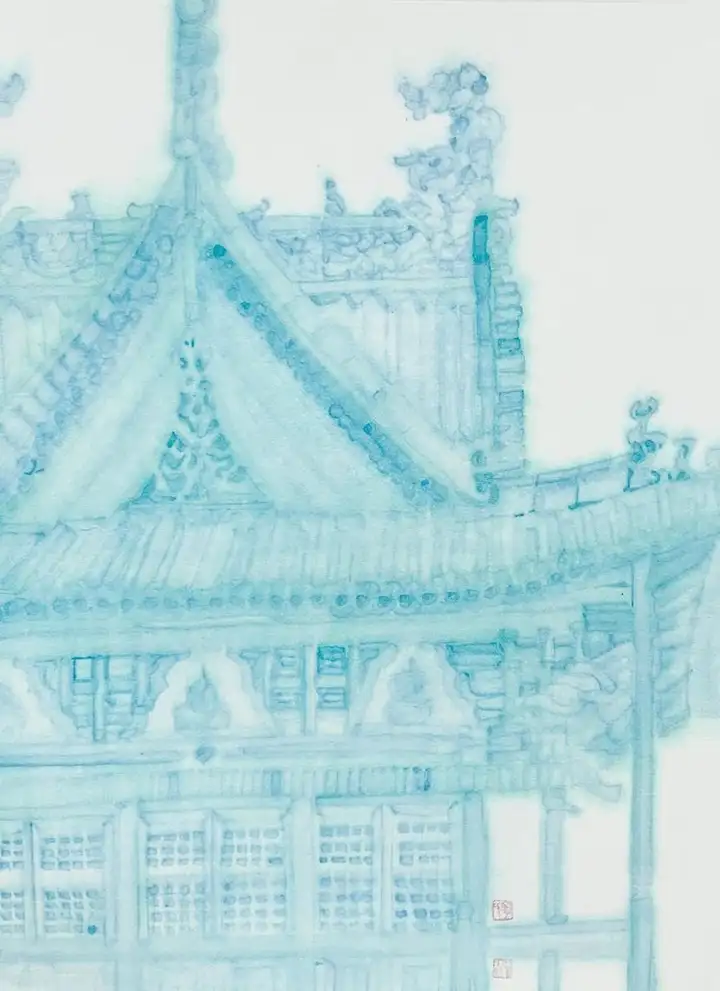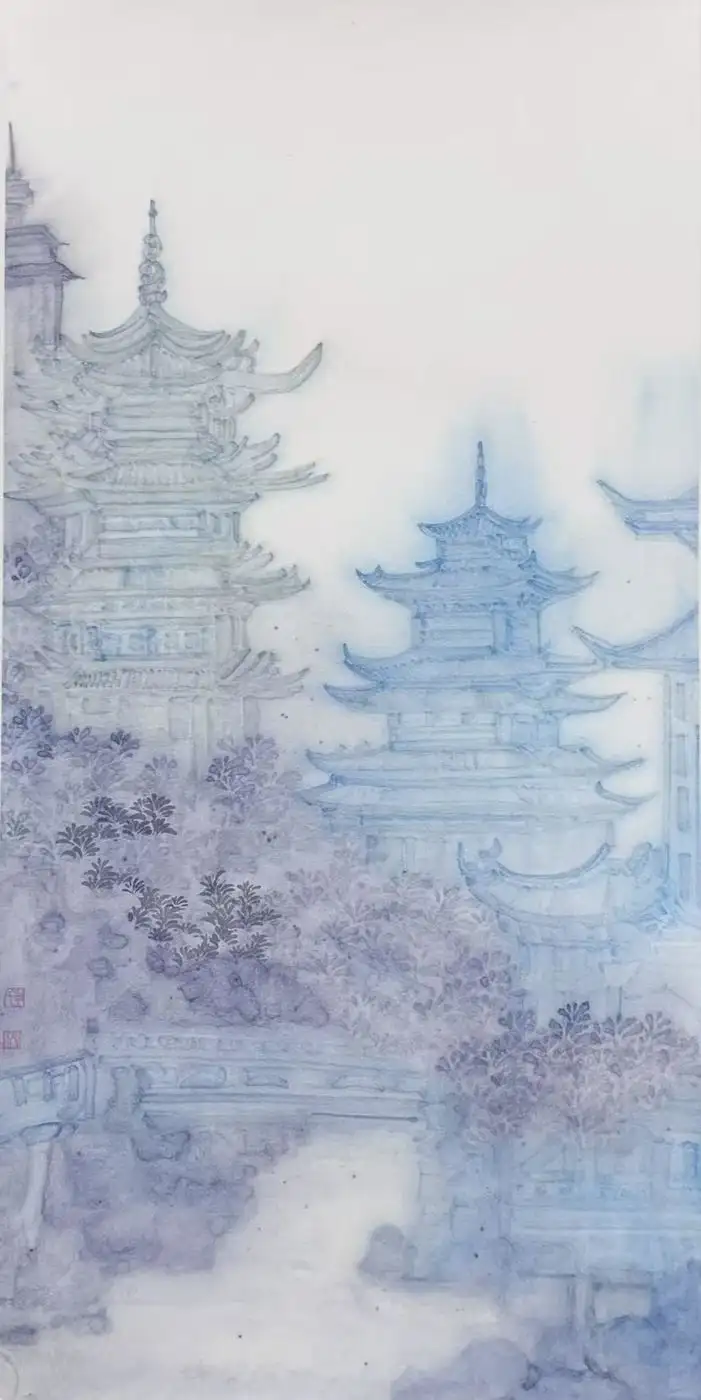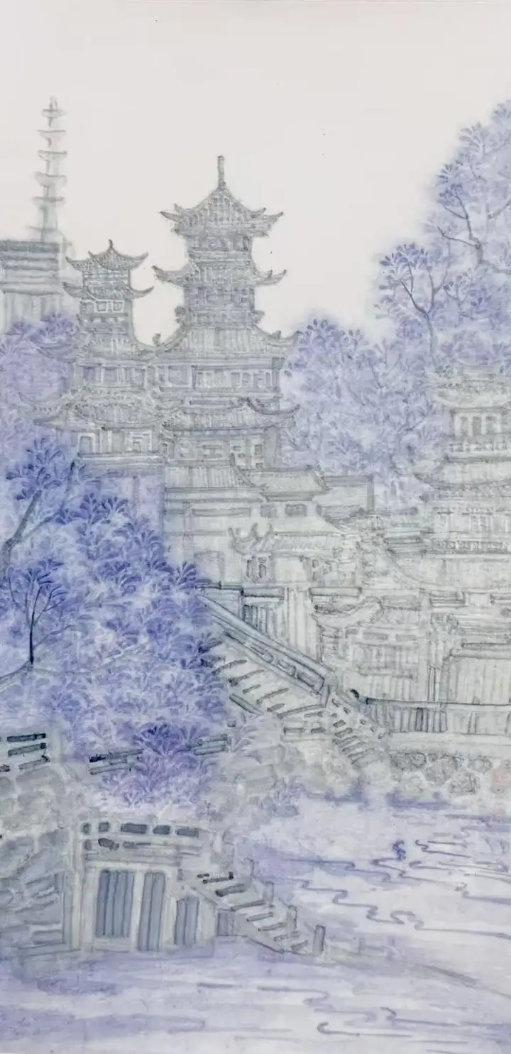 淡墨氤氲间,亭台楼阁若隐若现,宛如蒙着面纱的仙子,引人在虚实相交的意境中探寻道家哲思。