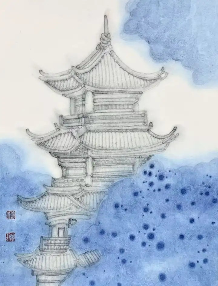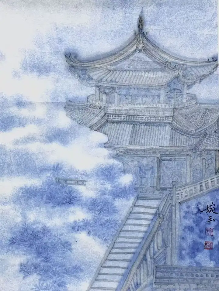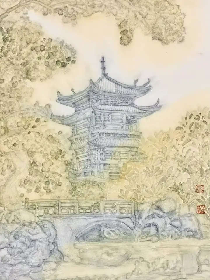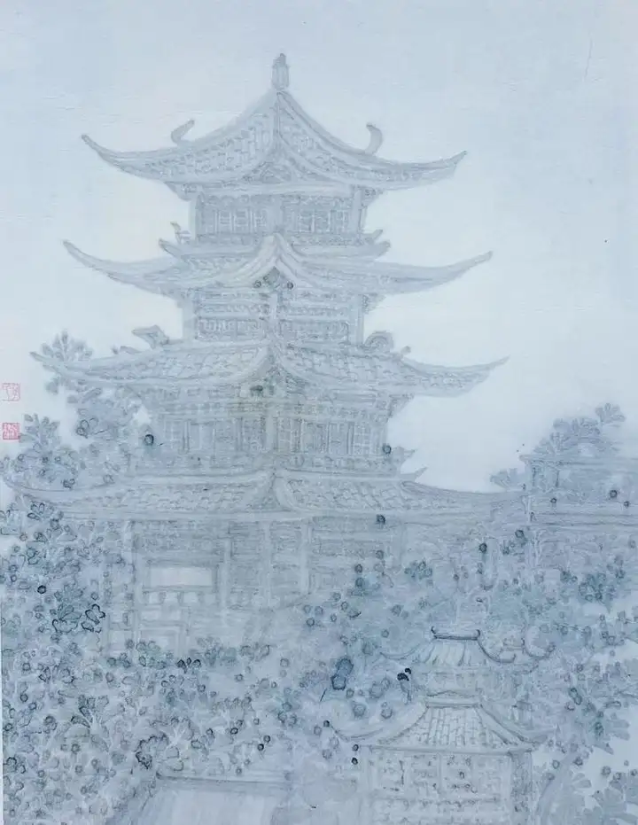 她笔下的仙亭轮廓若隐若现,恰似蒙着神秘面纱的仙子,欲语还休,引人无限遐想。而留白的运用更堪称神来之笔。在她笔下,空白绝非空无一物,而是“仿若天光穿透厚重云雾,闪烁其间”,赋予画面以灵动生机。