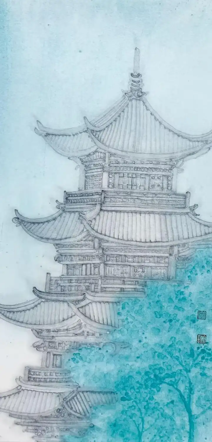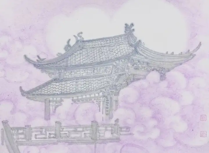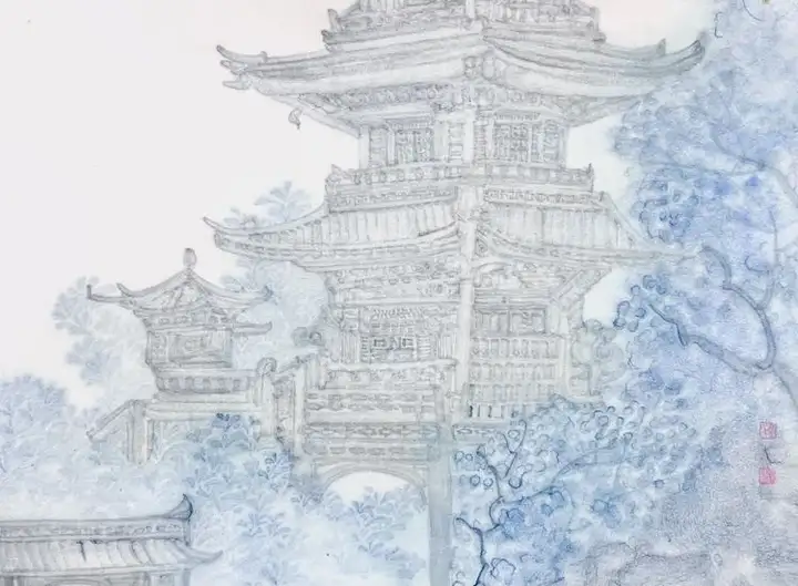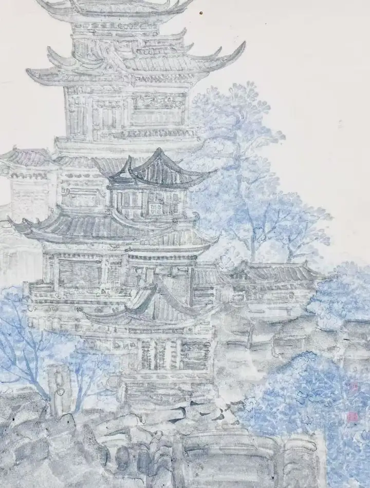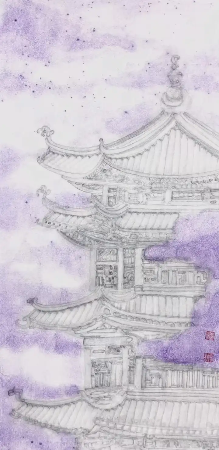 她笔下的仙亭轮廓若隐若现,恰似蒙着神秘面纱的仙子,欲语还休,引人无限遐想。而留白的运用更堪称神来之笔。在她笔下,空白绝非空无一物,而是“仿若天光穿透厚重云雾,闪烁其间”,赋予画面以灵动生机。