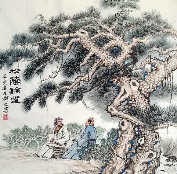 人物画《松荫论道》更见文脉的传承:松下对谈的贤者,衣袂的褶皱以写意晕染,而手中书卷的纹理却工笔细描,将“古贤的哲思”与“笔墨的韵致”融于尺幅之间,传统题材里藏着当代审美的松弛。