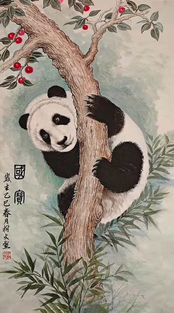题款“国宝”与“岁在乙巳春月树文画”的落款,添了文人画的格调。整体既显熊猫的憨态萌情,又有中式画作的雅致韵致,是传统技法与可爱题材的巧妙融合。