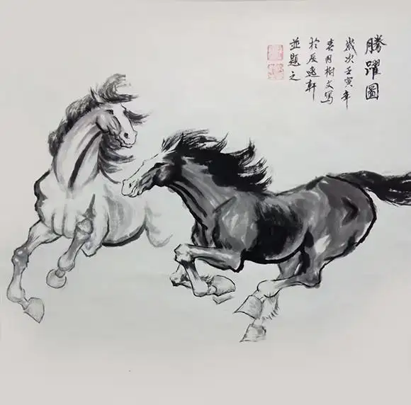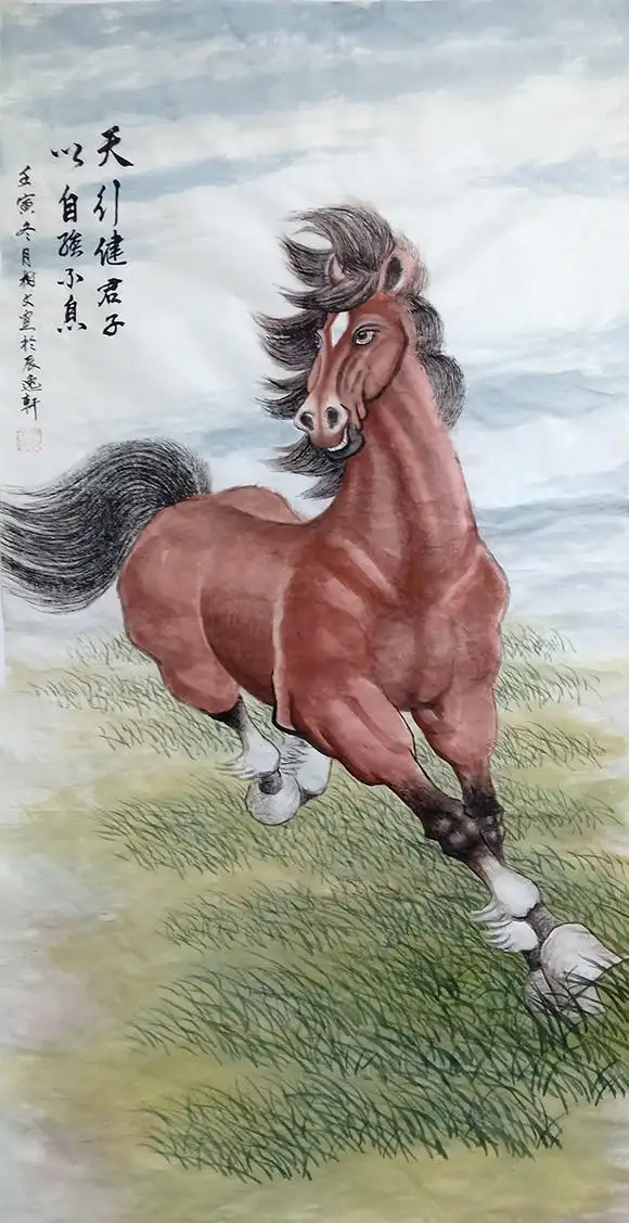 写意马则是他性情的另一种流露。《腾跃图》里,两匹奔马以泼墨法晕染出鬃毛的劲风,墨色的浓淡间藏着动态的韵律,马蹄腾空的弧度带着“一泻千里”的洒脱;而《天行健君子以自强不息》中的红马,以淡彩晕染出肌肉的肌理,鬃毛的飞白似有风在流转,既见徐悲鸿“奔马”的写意精神,又藏着他对“龙马精神”的当代诠释。这种“以墨驭势”的能力,恰是他在工笔沉淀后,对笔墨语言的自如掌控。