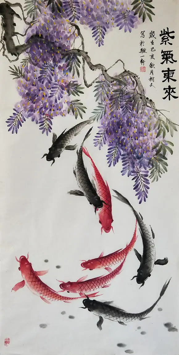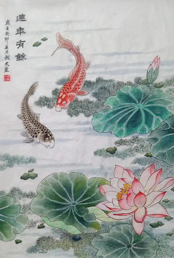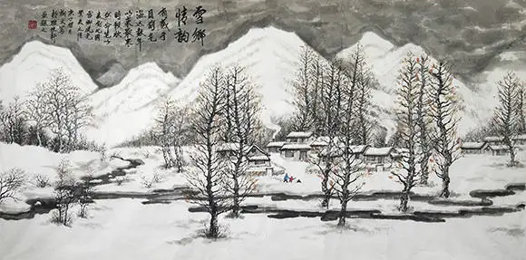 花鸟与山水,是他笔墨温度的延伸。《连年有余》中,锦鲤的鳞片以工笔勾勒出温润的光泽,荷花的晕染从浅粉过渡到嫩白,水波的留白似有涟漪轻荡,将“吉祥寓意”与“生活雅意”揉作一处;《雪乡情韵》则以水墨晕染出雪岭的苍茫,林间的小屋炊烟袅袅,雪地上孩童的身影带着烟火的暖意,让清冷的冬景多了人间的温度。
