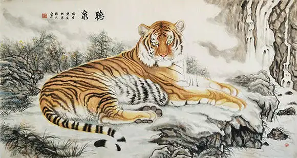 他的工笔虎,是最具代表性的符号。《听泉》中,卧于雪石间的猛虎,皮毛的纹理细若毫发,金黄的斑纹里藏着山林王者的威严,而那双琥珀色的眼眸,并非凶戾的嘶吼,而是带着沉静的警觉——这不是简单的“虎形”描摹,而是以工笔的细腻,刻画出猛兽的“生命质感”。每一根胡须的弧度、每一片皮毛的光泽,都藏着他对“万物有灵”的敬畏:“工笔不是炫技,是让纸上的生命‘活’过来。”