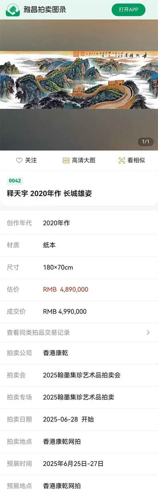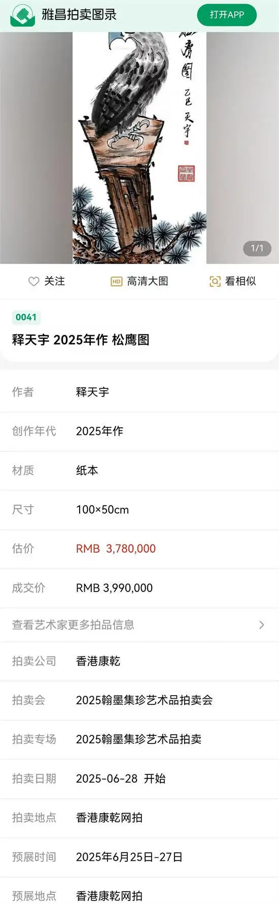 香港康乾拍卖公司在2025年6月28日举行的2025翰墨集珍艺术品拍卖会中,备受关注的艺术家释天宇作品《松鹰图》、《长城雄姿》经场内多轮激烈竞逐,最后以399万、499万元落槌成交,其作品价值和升值空间引起社会各界专业人士瞩目。